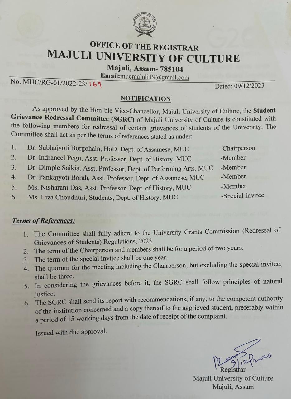 Advertisement of the Post of Registrar, Majuli University of Culture